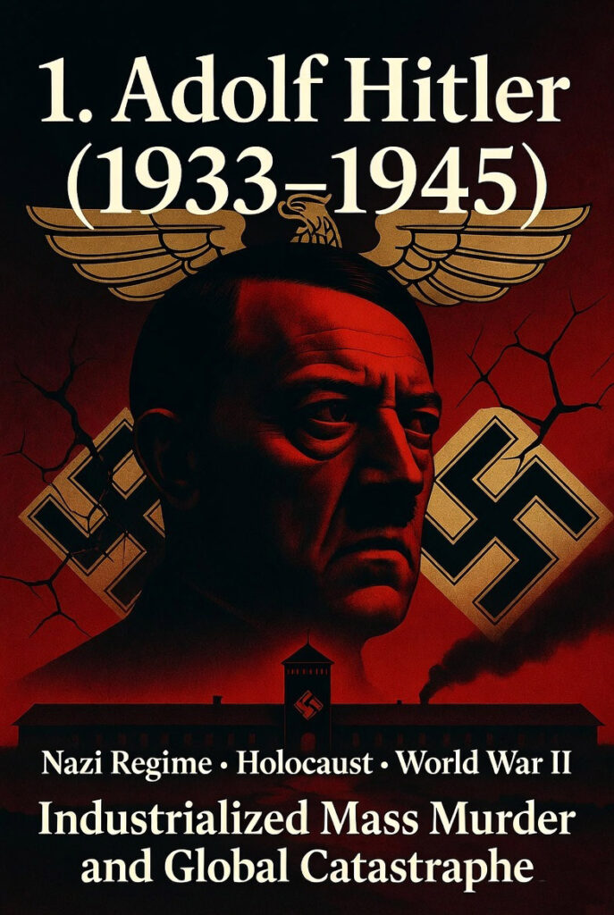Hitler’s Nazi regime fused racial ideology, propaganda, and bureaucratic efficiency into a program of systematic extermination and aggressive war. His belief in Aryan supremacy and the need for “Lebensraum” (living space) drove the Holocaust and World War II. The Nuremberg Laws of 1935 stripped Jews of rights, paving the way for ghettos, mass shootings, and death camps like Auschwitz-Birkenau, where gas chambers and forced labor killed approximately 6 million Jews and 5–11 million others (Roma, disabled people, Poles, Soviet POWs, and political dissidents). Hitler’s invasion of Poland in 1939 ignited a global conflict that caused 70–85 million total deaths. His refusal to surrender, even as Berlin fell, prolonged the agony. This era shows how a leader’s ideological obsession and centralized control can industrialize mass murder.