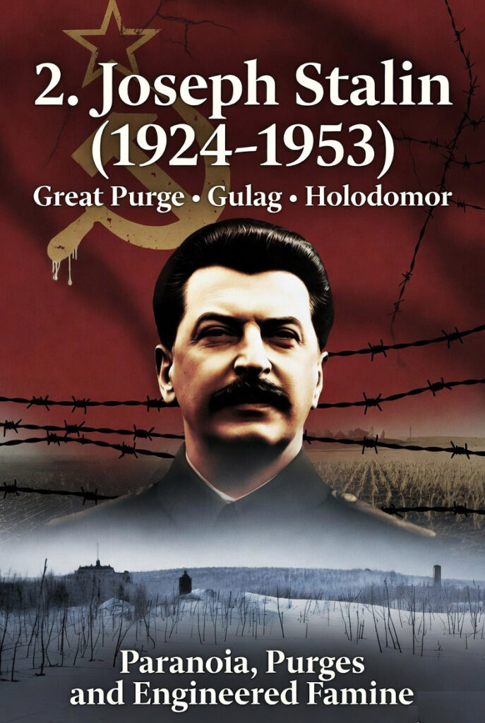 Stalin transformed the Soviet Union into a totalitarian state through paranoia-fueled purges and forced economic restructuring. The Great Purge (1936–1938) executed or imprisoned hundreds of thousands, including top military officers, weakening the country on the eve of war. The Gulag forced-labor system claimed millions more lives through starvation, exposure, and overwork. Most devastating was collectivization, which triggered the Holodomor in Ukraine (1932–1933), killing an estimated 3–5 million through deliberate grain seizures and border blockades. Overall scholarly estimates attribute 10–20 million deaths (or higher in some analyses) to Stalin’s policies of execution, famine, and deportation. His rule exemplified how fear, surveillance, and ideological rigidity sustain power at catastrophic human cost.
